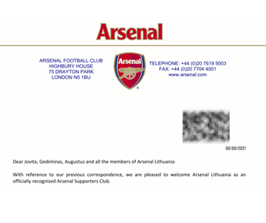 2021 m. rugsėjo 6-oji – diena, kuri amžinai įeis į „Arsenal Lithuania“ istoriją. Po nemažų svarstymų, diskusijų ir vidinių klausimų, ar verta žengti šį žingsnį, šią dieną tapome oficialiu „Arsenal“ futbolo klubo pripažintu fanų klubu.