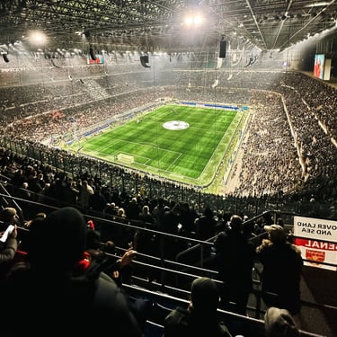 Atvykę prie legendinio stadiono šiek tiek nustebome – pirmiausia buvo įleidžiami „Inter“ sirgaliai, o „Arsenal“ fanai pateko tik po visų sustiprintų patikrų ir vadinamųjų trijų patikros punktų. Lauke praleidę apie 45 minutes, galiausiai judėjome link savo vietų, iš kurių, juokaujant, buvo galima pasigrožėti ir naktiniu vienu iš Milano kvartalų. Verta paminėti, kad išvykos sirgaliams stadione alkoholiniai gėrimai neparduodami.